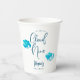 Dreamy and elegant baby shower paper cup featuring illustration of turquoise blue clouds. The text says "we are on cloud nine."