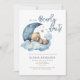 We can Bearly wait Baby Shower Invitation with cute teddy bear sleeping on puffy blue cloud and the half crescent moon and stars. Sweet boy baby shower invitation. Let everyone know you can "bearly wait" with this charming and gender-neutral invitation! Featuring an adorable design of a sleepy teddy bear nestled on a crescent moon, surrounded by fluffy clouds and twinkling stars, this invitation sets the perfect tone for a dreamy and heartfelt celebration. With soft, neutral colours, it’s ideal for welcoming a little boy or girl.