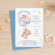 This cute Baby Shower invitation has the theme "We can bearly wait". It features a soft illustration of a happy baby teddy bear floating with balloons. Other cute elements such as stars, a little bird, and clouds complete this cosy design. The blue and brown colour palette is perfect for a mum-to-be expecting a baby boy.