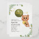 A baby bear flying with a green balloon. We can barely wait.