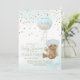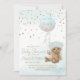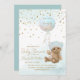A baby bear holding a blue balloon with the wording "we can barely wait". Simulated gold glitter.
