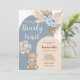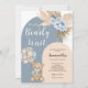 Celebrate the upcoming arrival with this charming "We Can Bearly Wait" Boy Baby Shower Invitation. The design features a sweet bear holding a bunch of blue and brown balloons, framed by a stylish blue and brown arc. Accented with delicate blue floral elements and pampas grass. BBS377