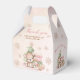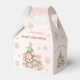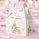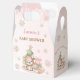 Christmas girl baby shower favour box. Features cute baby bear, Christmas tree and presents with faux glitter golden snowflakes and stars, all in pink, beige and green. Easily personalise all the text. - Kate Eden Art