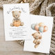 An adorable theme for a baby shower to welcome a baby boy, this invitation features a baby boy teddy bear holding an autumn pumpkin. The theme "We Can Bearly Wait" in whimsical text arches across the top of the baby bear. So cute! It's a great choice for baby showers in the fall months. Personalise the simple text template with your shower details. On the back of the invitation, another adorable graphic depicts the baby bear holding a bunch of balloons as though they are suspended in mid-air.