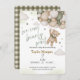 Celebrate the sweetest upcoming arrival with this “We Can Bearly Wait” baby shower invitation. Featuring a soft beige and sage green teddy bear holding balloons, fluffy clouds, and a gingham border, this design adds a cosy, gender-neutral touch. Perfect for woodland or teddy bear-themed baby showers. Personalise easily with your own details for a warm and memorable celebration.