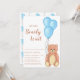 This boy's baby shower invitation is decorated with a cute teddy bear and blue balloons.