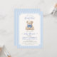 This sweet baby shower invitation features an adorable teddy bear accented with a soft blue bow, framed by elegant pastel blue stripes and graceful typography. The design has a gentle, classic feel that makes it perfect for welcoming a baby boy with warmth and style.