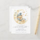 An adorable teddy bear sitting on a crescent moon, with stars above, with the expression: "we can bearly wait". A trendy cute style for your big announcement. Modern serif type contrasted with script typography. An economical budget friendly postcard version.