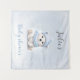 Adorable backdrop tapestry for winter boy baby shower in soft blue, white and grey featuring the cutest happy baby polar bear in a blue hat and scarf. Easily personalise the text. - Kate Eden Art