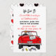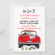 Vintage convertible car with bride and groom and just married sign with cans hanging off the back of their car driving away after party invitation.