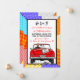 Vintage retro pop art convertible car with bride and groom and just married sign with cans hanging off the back of their car driving away after party invitation.