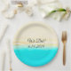 Ocean shore, teal water, sandy beach, paper plates perfect for a beach themed wedding or baby shower. The text says, "We Did," and you can edit the date.