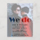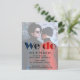 We Do, is a wedding stationery set ideal to announce an autumn wedding date. The postcard shows engraved the words we do in a half transparent overlay set against a romantic photo of the bride and groom to be. The photo scene is an urban setting against an eroding wall with the couple dressed in red and blue.