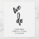 These simple, elegant black and white wedding wine bottle labels feature edgy modern handwritten script typography that says "we do", on a white background.