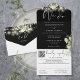 All-in-one black and white wedding invitation featuring pretty string lights, floral greenery and elegant typography. The invitation includes a perforated RSVP card with your wedding website QR code and details. Designed by Thisisnotme©