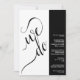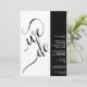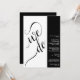 This modern typographical wedding invitation features a unique 2 pane design with the text "we do" in bold black calligraphy script lettering on a white background. The invitation details are right justified in a black bar along the right hand side. Elegant artistic design perfect for a sophisticated contemporary wedding.
