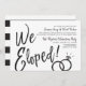 A fun and unique script lettered invitation tailored specifically to your post-nuptial wedding party or dinner. It features the words "We Eloped " with wedding rings resting above it. Underneath this Is space for your unique party or event details. On the reverse side are chic black and white stripes to complement the front.