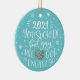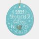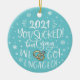 Celebrate your engagement with this fun and modern ceramic ornament. The front features a trendy hand-lettered caption that reads "2021 you sucked! But yay, we got engaged!" in white hand-lettered fonts over a light blue background, and is decorated with snowflakes and an illustration of two engagement rings.