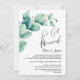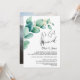 Invite your friends and loved ones to your post-wedding reception with this watercolor green eucalyptus leaves invitation to celebrate your recent marriage that features an image of the happy couple on the reverse side.