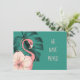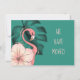 A pretty flamingo wearing a tropical hibiscus is displayed against a teal monstera leaf on a blue-green background. The pink text on front of our change of address announcement card says: "We have moved" and these words can be changed to your own on the template, along with the new address info on back of the card.