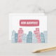 Cartoon style pattern with pink and blue retro buildings for a very exclusive new address announcement.