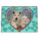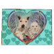 Cute watercolor of sweet dogs in heart shaped picnic scene, with teals, purples, blues, pinks, reds, and peach