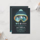 A winter-theme invitation that's stylish and bold. The deep blue background features a ski mask and hat with a reflection of mountain peaks covered in snow. Beneath the mask the words "We (hearts) snow" says it all. Perfect for any age and either gender. (FP)