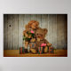 Antiker Teddybär und eine Puppe mit Rosen und LOVE Bausteinen vor alter Holzwand