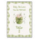 These table numbers feature a sage green and white gingham border with a watercolor matcha latte illustration in a mason jar. Design includes a large soft green bow tied around the jar and tiny scattered hearts in muted green tones. Shows the playful text "Baby, We Love You So Matcha!" in matching green lettering. Perfect for marking tables at your baby shower seating arrangement. Coordinates with the full matching collection for a complete event look.