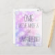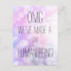 NewParkLane - Funny Birth Announcement Postcard for a newborn babygirl, with quote: 'OMG we've made a tiny human being', in modern typography, against a purple and pink shimmery, sparkling bokeh background.