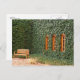 A peaceful garden with ivy covered walls, a wooden bench and 3 wood framed windows. Photography by Minerva Bloom.
