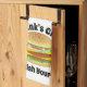 This funny towel, perfect for kitchen, bar, or grill has an illustration of a juicy cheeseburger and reads "(Your Name)'s Grill" "We Relish Your Buns".