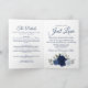 This beautiful folded invitation is designed for a vow renewal ceremony or wedding anniversary. The design features hand painted watercolor flowers in shades of dusty blue, navy, and indigo along with eucalyptus leaves and garden greenery. The front of the card features your photo in an oval frame with the text: We Still Do written in elegant script lettering. Inside is the standard invitation information with text reading: Nothing Fancy, Just Love. The opposite page has room for details or other information. Wonderful way to celebrate your enduring love with friends and family.