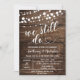 A design featuring romantic script type reads "we still do", string lights and rustic wood background.