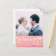 Modern Wedding Announcement Postponement Photo Postcard Templates - Elegant Lettering Script and Vintage Couple Mason Jars and String Lights on Light Pink Floral Background.
