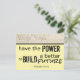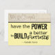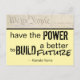 "We the People have the power to build a better future." --Kamala Harris. A better future, like a more perfect union, isn't guaranteed, it's something we have to work towards every day. Design description: The background is the first page of the Constitution, with We the People in large script at the top left corner. Below that, a black stripe. Below that, the rest of design space is a pale but eye-catching yellow, which has the quote in three fonts over two lines, a sans serif, a stencil font and a handwriting font and says, "Have the power to build a better future." Below that, in small sans serif text is an em-dash and the name Kamala Harris.