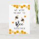 Cute anniversary pun card featuring hand illustrated bees with honeycomb and hearts. The funny text says "we were meant to bee together."