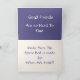 A note card printed on quality paper. A warm blue background on the front with text" We will miss you" Inside page with text reds "Good friends are hard to find" Make sure the spare bed is made when we visit"