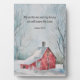 Bible verse art sign with stand features a charming red house amidst a snowy winter backdrop. Sign is a lovely way to display God's word in your home. Bible verse reads: "But as for me and my house, we will serve the Lord." From Joshua 24:15. Sign makes a lovely gift for housewarmings, newly married couples, and Christian friends.