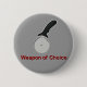 Happy pizza cutter button with "Weapon of Choice" text.