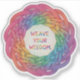 This design features the phrase "WEAVE YOUR WISDOM." prominently centered within a beautiful, circular wreath of braided material (like colorful thread or strands).