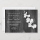 A wedding invitation featuring a background black and white image of white orchids over barnwood. Personalise with details of your occasion at left. Wording is from bride & groom together with their parents.