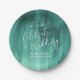 Emerald green modern abstract art painted wedding paper plates. Typographical text reads Eat, drink & celebrate the wedding of then add your own names underneath. A great personalised addition to your wedding buffet or party tables. Other matching items and colours available in this design. © Original watercolor art and design by Sarah Trett for www.mylittleedenweddings.com