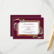 An elegant Bohemian, boho style wedding accommodations details card. A faux gold and white frame. Watercolored roses and feathers, flowers in burgundy. Templates for your wedding accommodation details. Burgundy background and text.
