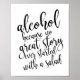 An elegant cutting edge wedding sign, features the text "alcohol because no great story ever started with a salad" in a extroverted script font, the brush texture adds a spontaneous and playful feeling. The background color can personalized according to your needs and preferences, please contact me if you have any special request.