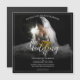 Wedding announcement with a picture of a dreamy bride sitting with a yellow bouquet of flowers in the penumbra - classic style.