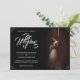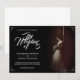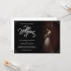 Wedding announcement with the image of a dreamy bride leaning against a wall with a bouquet of white flowers in the penumbra - classic style.