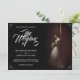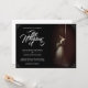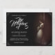 Wedding announcement with the image of a dreamy bride leaning against a wall with a bouquet of white flowers in the penumbra - classic style.