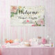 Wedding Banner Templates - Vintage Watercolor Pink Flowers and Elegant String Lights on Rustic Light White Wash Soft Wood Texture Background.