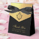 An elegant black and gold wedding favor box. The flap is faux gold foil and it has a black crest with the wedding monogram in it, from the two initials of the bride and groom.